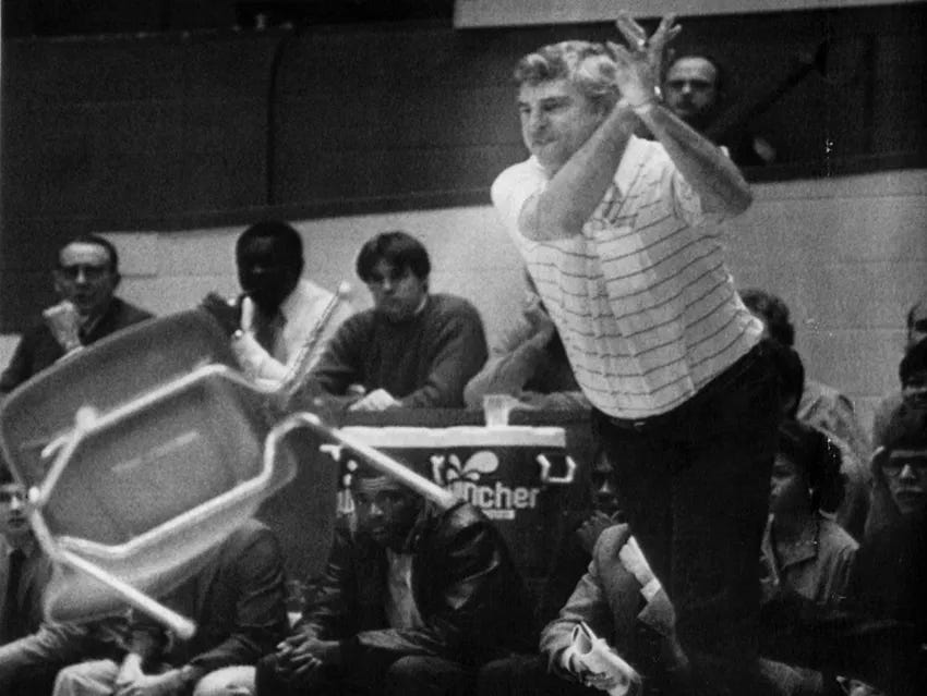 1985 | Hosier basketball coach Bobby Knight threw a chair on the court mid-game. This occurred during an Indiana vs. Purdue game.