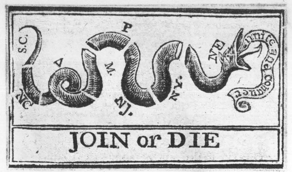 1754 | The first newspaper cartoon of the divided snake in America, “Join or Die,” is published.